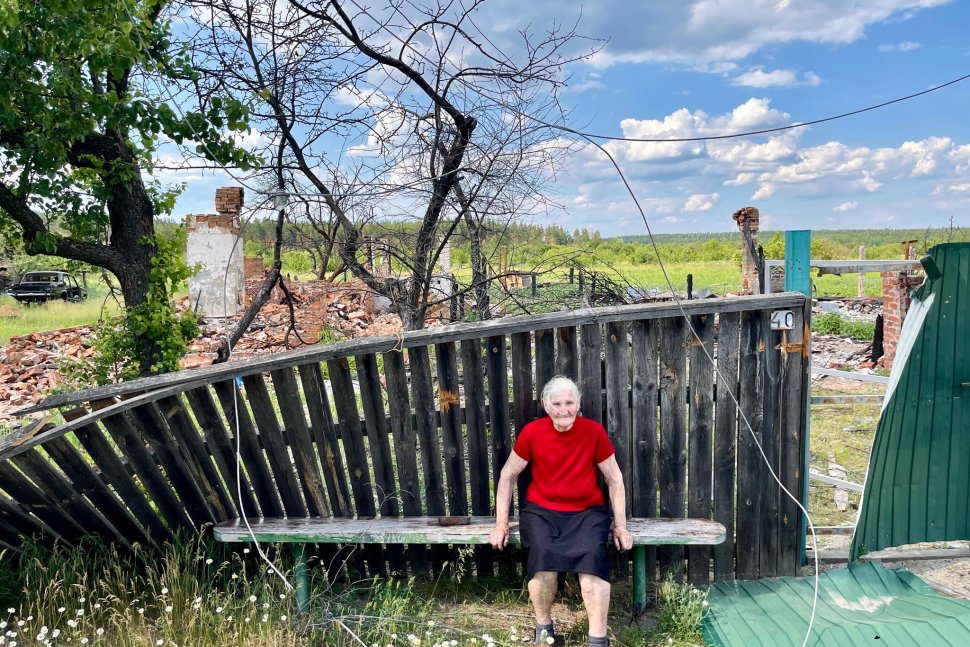 Pani Maria siada na swojej ulubionej ławeczce, tak wygładzonej od siadania, że siedzisko wygląda jak z marmuru, nie dębowej deski. Widać, że spędzała tu całe dnie, mając przed sobą widok na sąsiednie gospodarstwa, a za sobą swoje pole – powód do dumy. Wieś była całym jej światem. 85 letniej kobiecie została już tylko ta ławka. Wszystko co miała, zniszczyli Rosjanie. Ze łzami w oczach pokazuje nam, gdzie była kuchnia, gdzie sypialnia…. Wszystko jest teraz stertą gruzu. Pani Maria musiała uciekać, teraz nie ma do czego wracać. — Nie mam, gdzie spać, a pole, na którym miały rosnąć już warzywa, usiane jest minami.