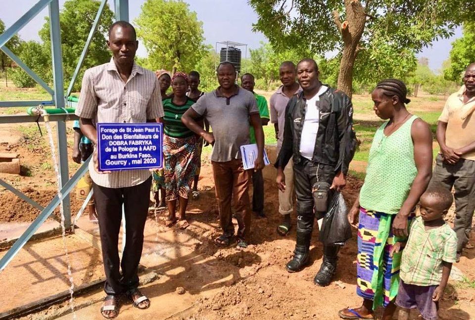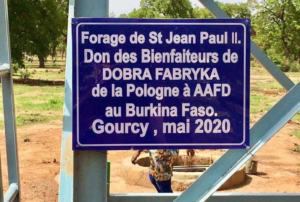 Dwie głębinowe studnie już działają. Jedno źródło dostało nawet imię Jana Pawła II. “Od darczyńców z Dobrej Fabryki z Polski dla rolniczej spółdzielni w Burkina Faso.” Woda zasili uprawy w nowej części ogrodu.