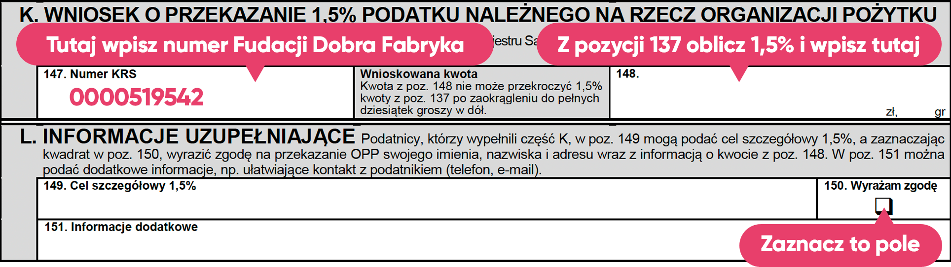 Fundacja Dobra Fabryka posiada status organizacji pożytku publicznego (OPP), dlatego możesz przekazać 1,5% swojego podatku dochodowego na rzecz naszych podopiecznych i tym samym odmienić ich los.
