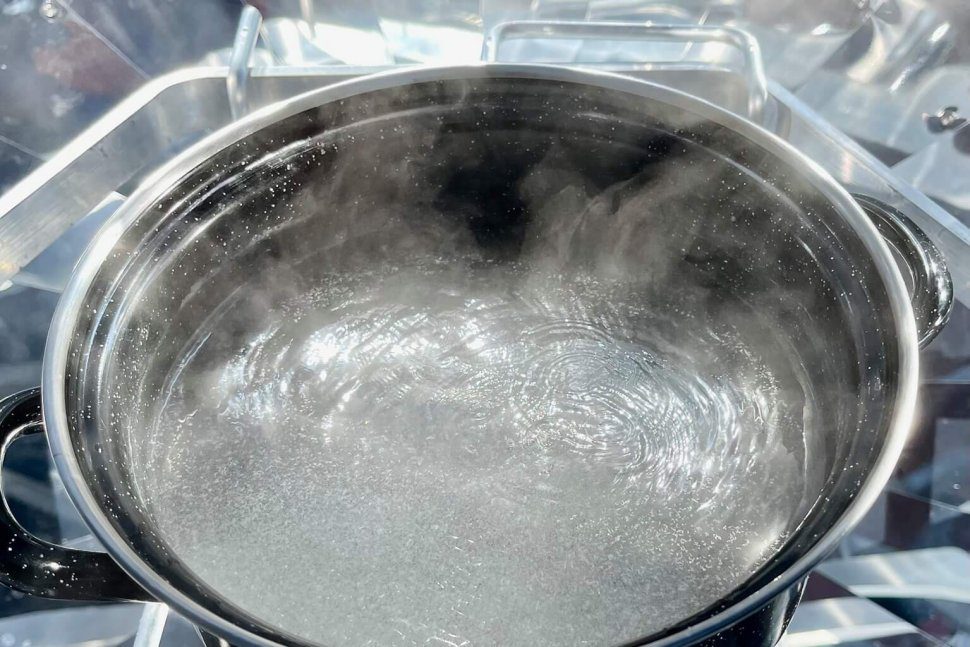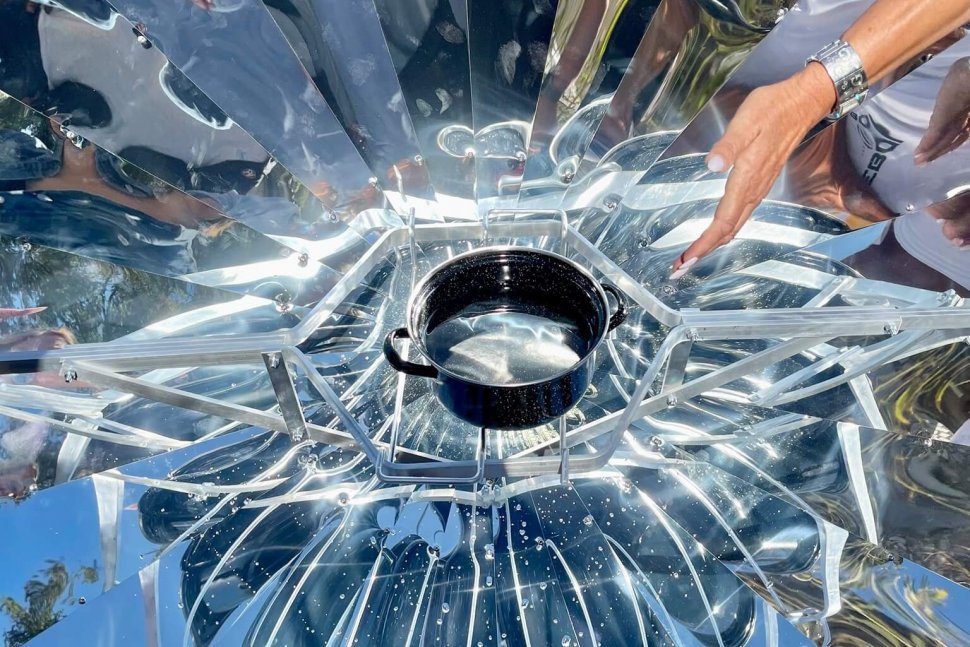 No. We are not making contact with alien civilisations. We are boiling water. A few litres in just 10 minutes. Without electricity, coal, gas, or even batteries. Today at Home for All we are testing a solar cooker. A clear sky is enough to cook a meal for the whole family on this device, make tea in the meantime and heat water for the bath. Can you imagine how many problems this invention would solve in the Greek camp and… in Africa?!?!