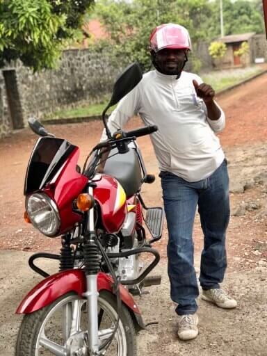 Here it is: Jean’s brand new, two-wheeled work tool. During the volcanic eruption he lost everything he and his wife Devota had worked so hard for over the years. Today there were tears of joy and a lot of happiness. Jean wants to say thank you! Aksanti!!!