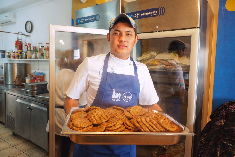 Les premiers à s’asseoir aux tables de la terrasse du restaurant ont été des convives exceptionnels. Ce sont 30 bénévoles, résidents du camp, qui, bien qu’eux-mêmes vivent dans des conditions difficiles et incertains, ne sachant pas quel est leur avenir, sont prêts à aider au quotidien leurs compagnons de route, en nous aidant à fournir aux plus faibles des repas chauds et des nécessités de base.