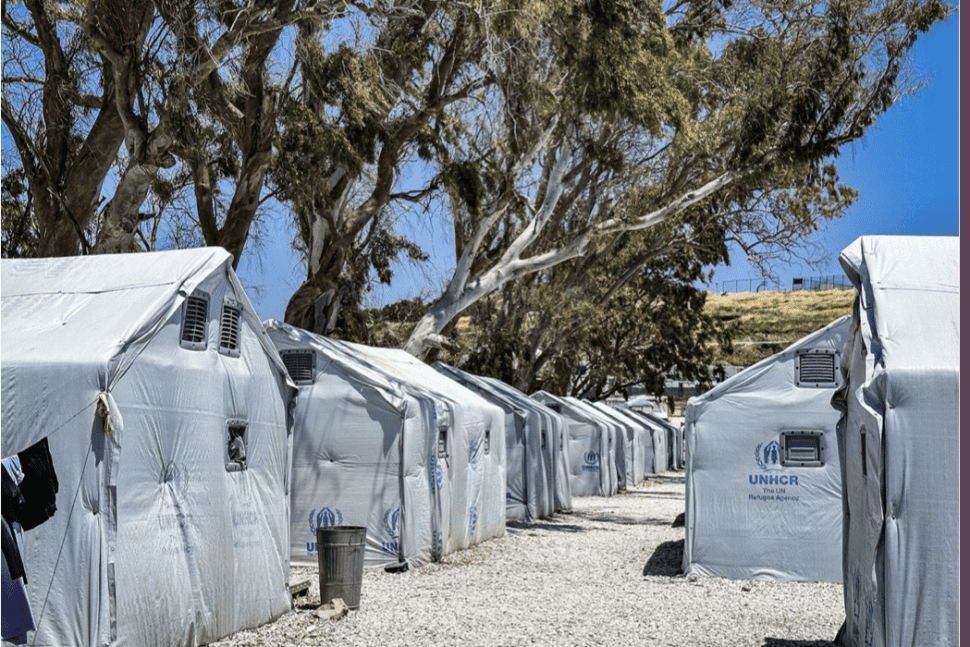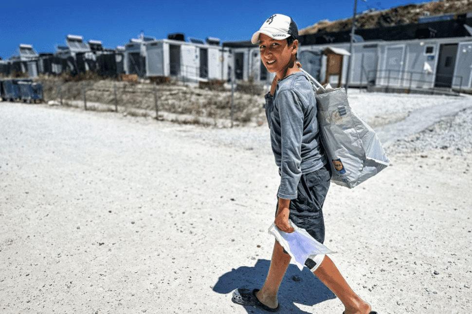 La chaleur étouffante tombe du ciel. Il fait 40 degrés à l’ombre à Lesbos. Il n’y a pas d’ombre dans le camp, donc tout le monde rôtit dans une chaleur encore plus grande. À 12 h 30, un bus avec des repas de notre cuisine Home for All traverse la porte du camp. Un groupe de jeunes hommes nous attend au milieu du parc. Chaque jour, ils participent à la distribution des repas, visitent les malades et les diabétiques.
