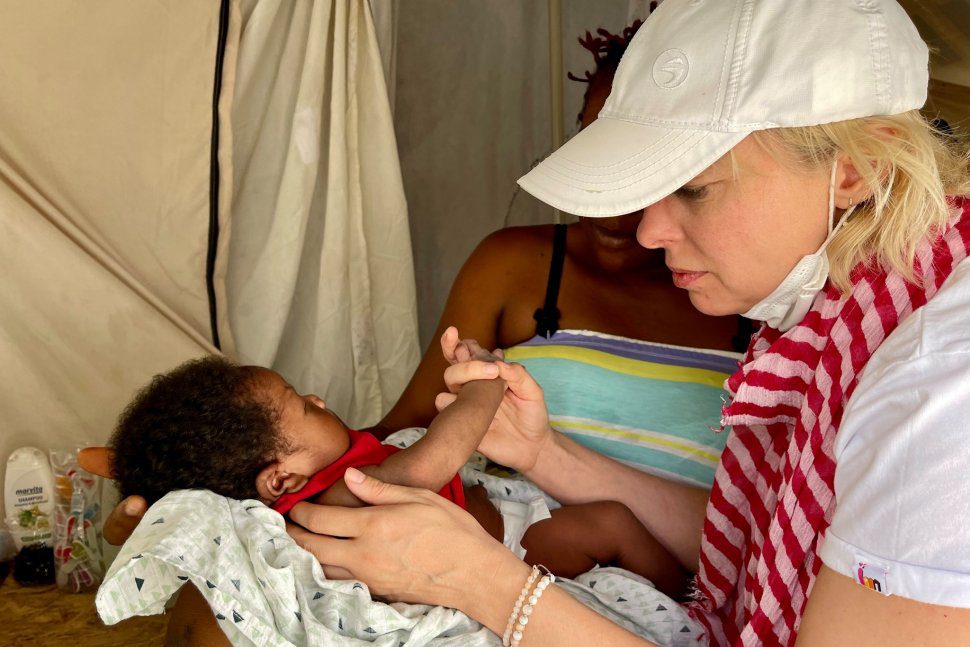 Cette fois, nous sommes sur l’île non seulement pour nourrir les affamés, mais aussi pour guérir et soulager la douleur – pour répondre au besoin humain le plus fondamental, qui est l’accès aux soins médicaux. Ola, une pédiatre, est avec nous, avec qui nous regardons les autres tentes. Dans l’une d’elle, nous rencontrons Mimi. C’est une maman fraîchement sortie du four. Benny est né il y a trois semaines. À la suite d’un accouchement mal fait, le bébé souffre d’une paralysie du plexus de l’épaule. Néanmoins, après quelques jours, il est sorti de l’hôpital et, avec sa mère, s’est retrouvé dans la tente du camp. Mimi ne sait pas quoi faire ensuite.