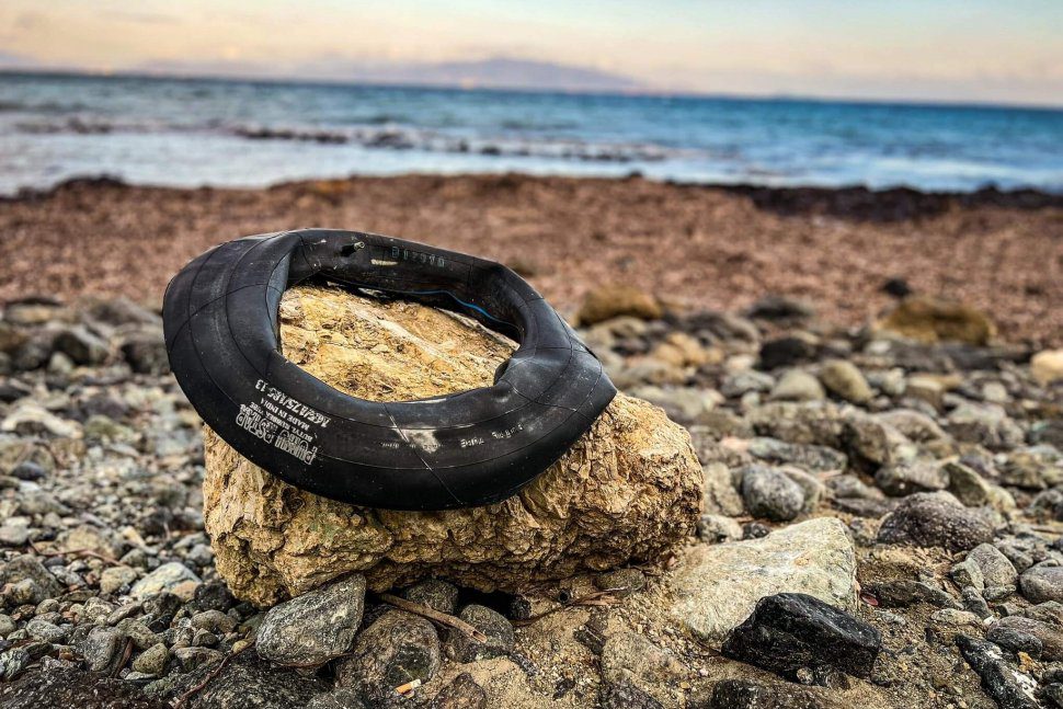 Il n’y a pas de réfugiés sur la plage aujourd’hui, mais il est clair qu’ils sont passés par ici. Gilets de sauvetage, chaussures et chambres à air servant de bouées de sauvetage avaient été abandonnés à la hâte. Le paysage ajoute à la tragédie de tout le gâchis. La mer orageuse, les rafales de vent et le froid pénétrant. Pour décider de faire une traversée aussi meurtrière, il faut avoir une vie calcinée derrière soi. Il faut vraiment craindre plus de rentrer chez soi que de se battre pour sa survie au milieu d’une mer déchaînée.
